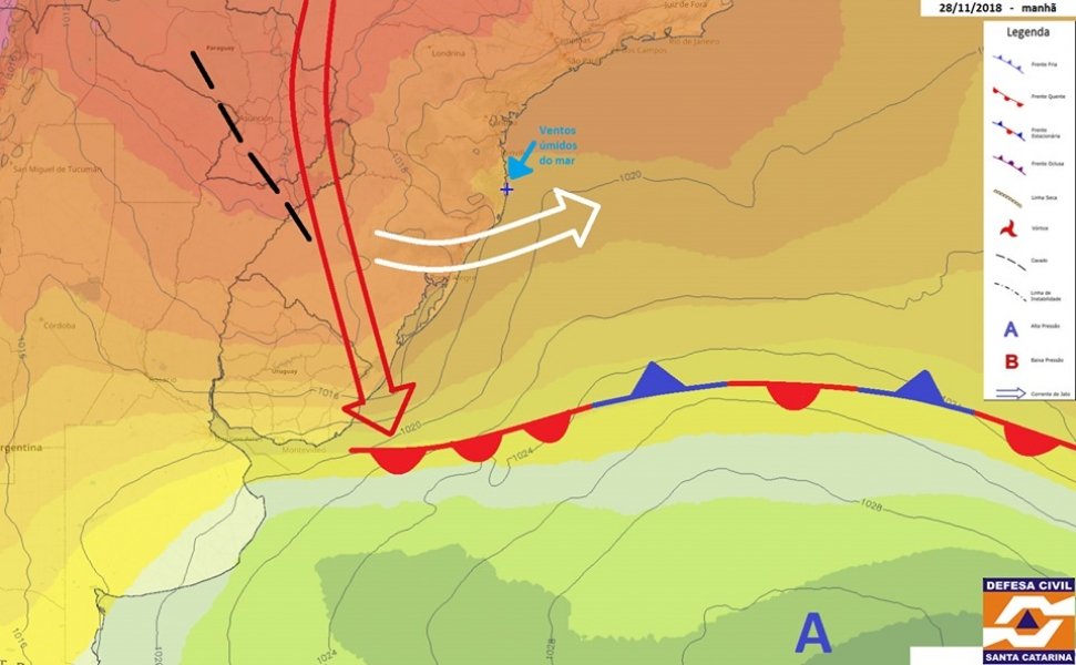 A Defesa Civil de Santa Catarina destacou a mudança no tempo na região. Nuvens altas e médias se formam devido a presença da Corrente de Jato (ventos fortes no alto da atmosfera) entre RS e Litoral Sul catarinense.
