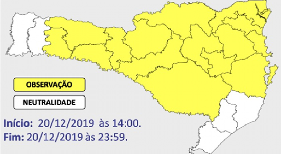 Agora pela manhã o órgão emitiu alerta para temporais isolados para cidades do Extremo Oeste, Oeste, Meio Oeste e Planalto Norte nas próximas duas horas.