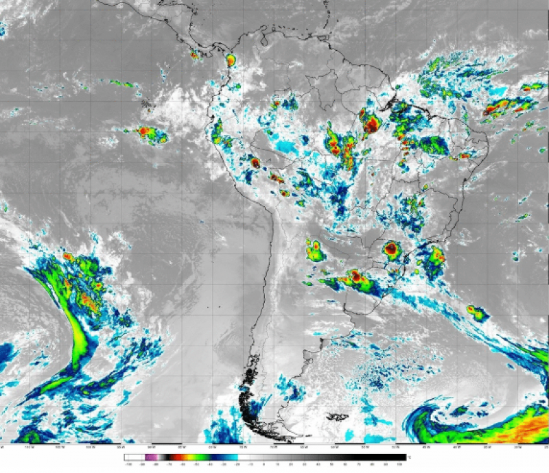 A previsão é para pancadas de chuva moderada a forte em alguns momentos e rajadas de vento acima de 70 km/h. Acumulado de chuva de 40 a 60 mm em média e pontuais maiores. Pode ter queda de granizo.