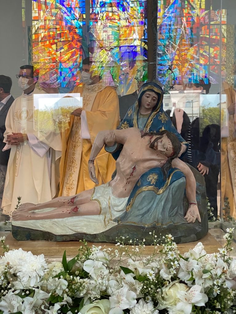 Ao ser tirado da cruz, a mãe acolhe o filho morto em seu colo, nos seus braços. “Sem dúvida alguma é uma cena triste e difícil. É uma mescla de morte, perda, mas ao mesmo tempo é uma presença de mãe que no momento mais horrível da vida do seu filho se faz presente. Isso ocorre, sobretudo, pelo vínculo do amor que é próprio de mãe. O amor nunca é ausente, é uma experiência de presença, principalmente nos desertos da vida, nos momentos difíceis. É a presença da fé que naquele espaço ermo, desértico, no sentido de vazio, morto que é o calvário, Maria se torna essa boa presença, a de mãe e do amor. A nobre flor que desabrocha no deserto e exala o perfume da esperança e de uma nova realidade que é a ressurreição”, explica.