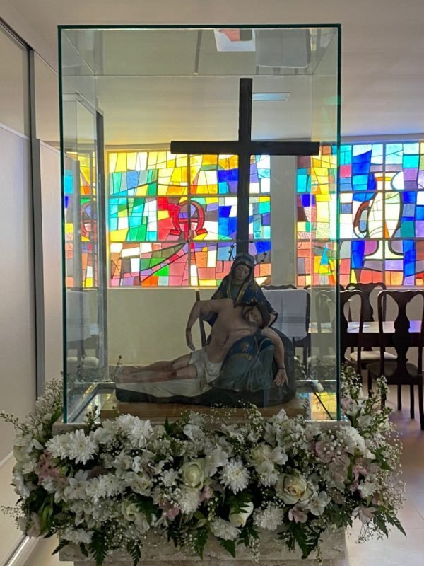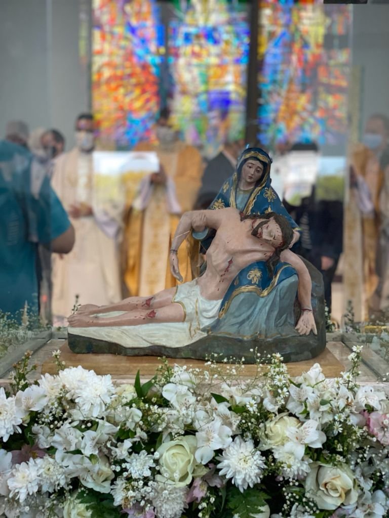 Ao ser tirado da cruz, a mãe acolhe o filho morto em seu colo, nos seus braços. “Sem dúvida alguma é uma cena triste e difícil. É uma mescla de morte, perda, mas ao mesmo tempo é uma presença de mãe que no momento mais horrível da vida do seu filho se faz presente. Isso ocorre, sobretudo, pelo vínculo do amor que é próprio de mãe. O amor nunca é ausente, é uma experiência de presença, principalmente nos desertos da vida, nos momentos difíceis. É a presença da fé que naquele espaço ermo, desértico, no sentido de vazio, morto que é o calvário, Maria se torna essa boa presença, a de mãe e do amor. A nobre flor que desabrocha no deserto e exala o perfume da esperança e de uma nova realidade que é a ressurreição”, explica.
