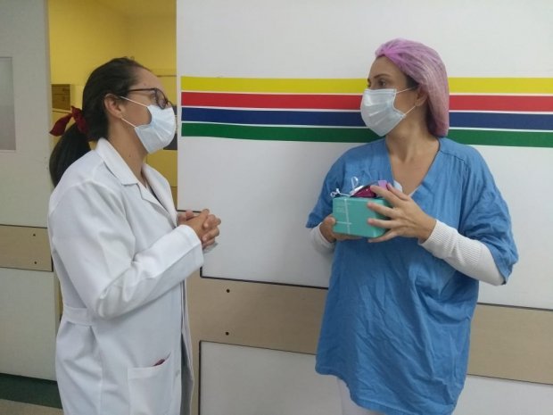 Para estimular e agradecer às doações, uma pequena homenagem foi realizada nesta terça-feira pela coordenadora do Banco de Leite Humano da Maternidade Carmela Dutra, enfermeira Cecília Melo, a uma das maiores doadoras de 2019. A técnica em enfermagem Cláudia Conceição Santos, servidora da UTI do Hospital Celso Ramos, doou cerca de 56 litros de leite materno pelo período de um ano aos recém-nascidos da Carmela.