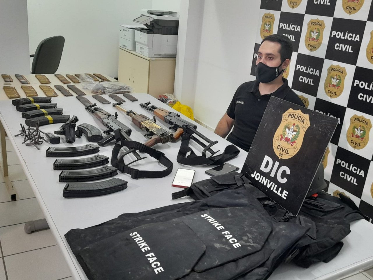 Tudo estava em posse de três indivíduos de São Paulo. Todos estão presos. Conforme as investigações, tudo aponta para que o trio iria possivelmente realizar um mega assalto na região de Joinville, nos mesmos moldes do assalto a banco praticado em Criciúma, em 30 novembro de 2020.