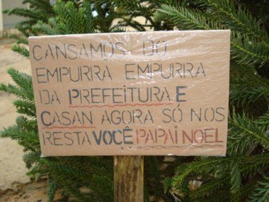 Os moradores aproveitaram a situação: “plantaram” um pinheiro, decoraram a árvore e colocaram uma placa bastante irônica: “Cansamos do jogo de empurra-empurra da prefeitura e Casan. Agora só nos resta você, Papai Noel”.