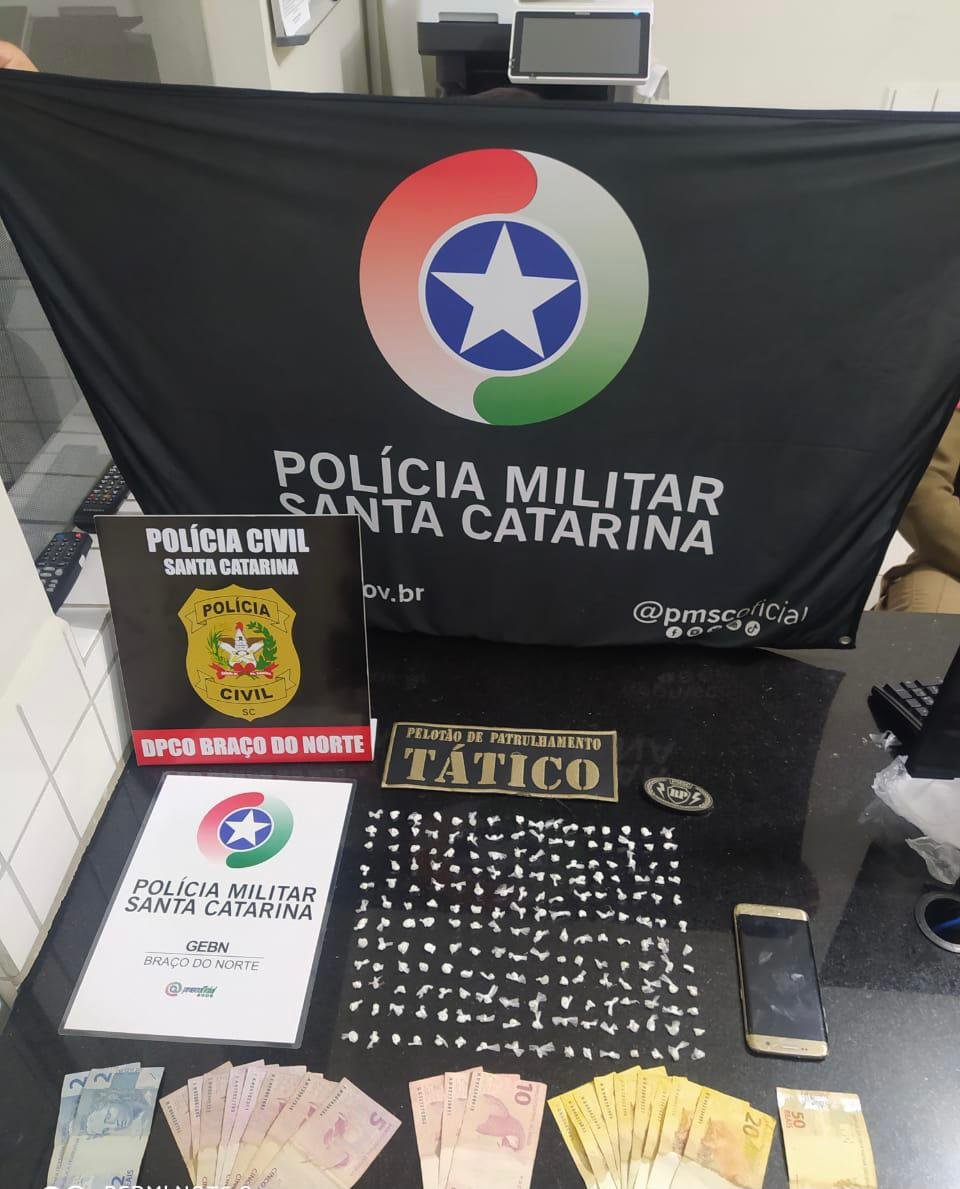 Esta ação foi realizada em conjunto com a Polícia Civil de Braço do Norte. Ao chegar no local os policiais não localizaram o criminoso, mas, no quarto do casal, os policiais apreenderam as drogas e o dinheiro, referente ao comércio ilícito de drogas.