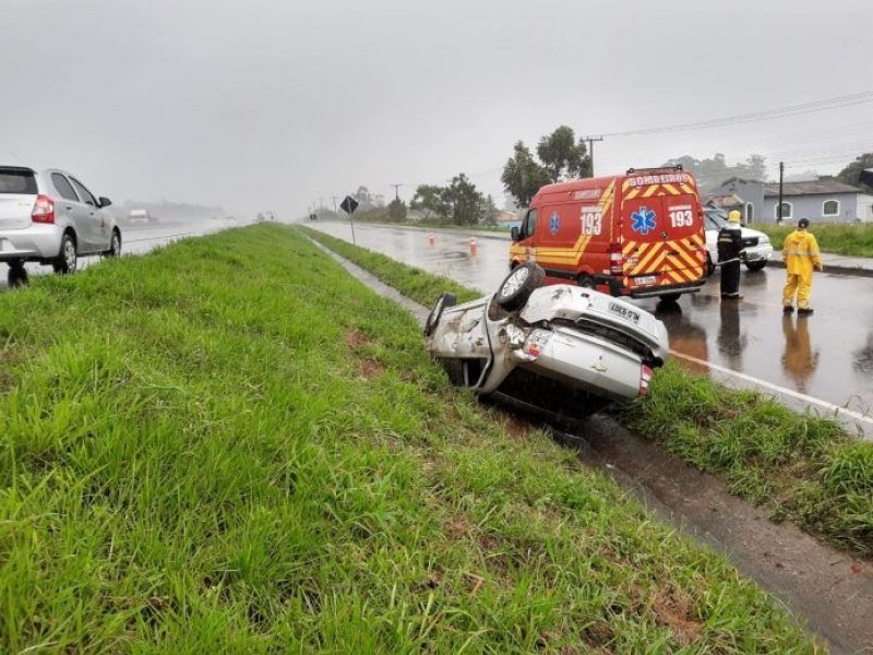 O Corpo de Bombeiros Militar (CBM) foi acionado por volta das 15h desta sexta-feira, 31, para atender uma ocorrência de capotamento na BR-101, em Bentos, em Laguna. O acidente foi registrado no sentido Sul e ocorreu após uma saída de pista, provocada por aquaplanagem.