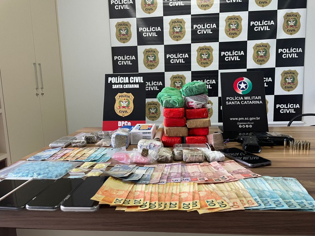 Além deles, uma mulher foi autuada pelo crime de posse de entorpecentes. Os policiais apreenderam seis quilos de maconha, 152 comprimidos de ecstasy, 25 gramas de MDMA, 3,3 gramas de cocaína, 24 munições, além de aparelhos de telefone celular, dinheiro e outros apetrechos relacionados ao narcotráfico. Os presos por tráfico de drogas foram encaminhados à Unidade Prisional Avançada (UPA) de Imbituba.