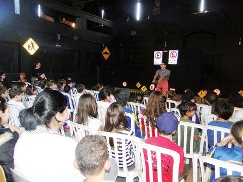 As crianças assistiram a uma peça apresentada pelo grupo Desmontagem Cênica. Os atores demonstraram a importância de obedecer as leis de trânsito.