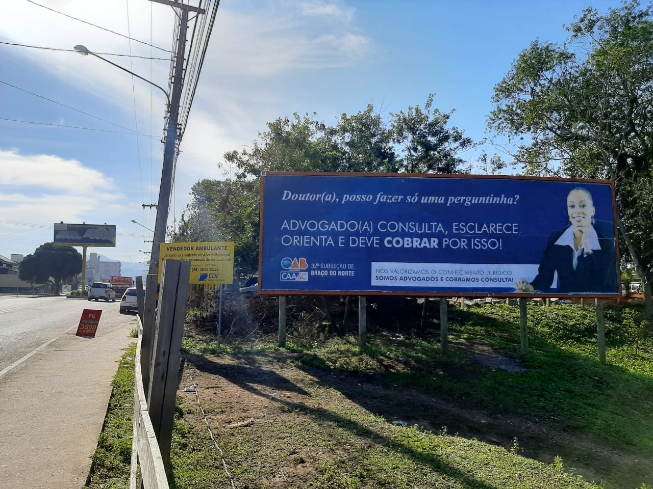 Um dos outdoors chama a atenção com o seguinte questionamento “Doutor(a), posso fazer só uma perguntinha?” o que é seguido da seguinte resposta “Advogado(a) consulta, esclarece, orienta e deve cobrar por isso!”.