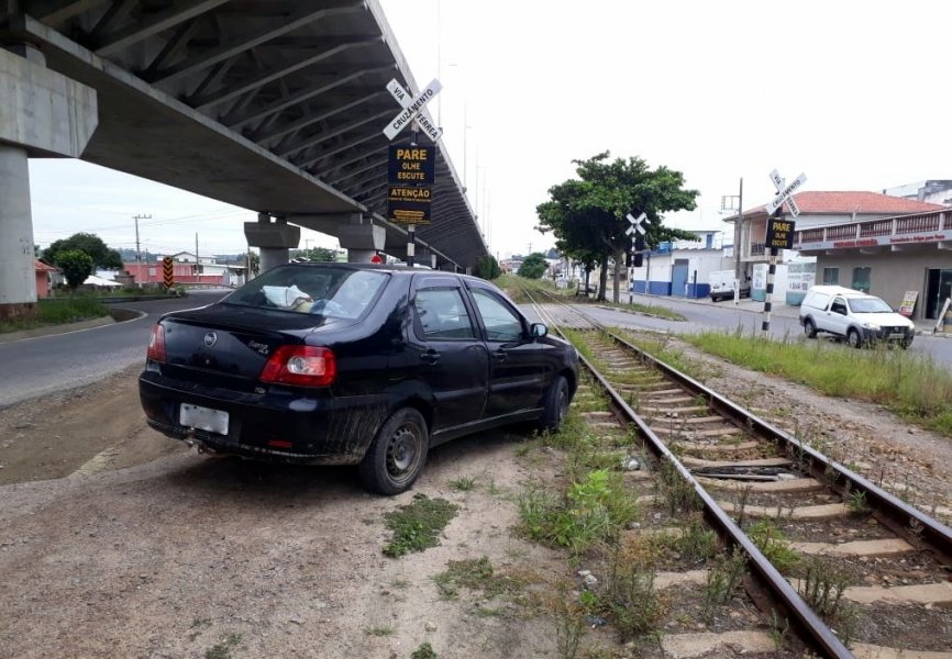 Os policiais foram informados pelo vigilante da ferrovia de que um Fiat Siena, placas de Laguna, estaria aparentemente abandonado, trancado e sem as chaves, quase sobre os trilhos. Rapidamente, foi acionado o guicho, que removeu veículo.