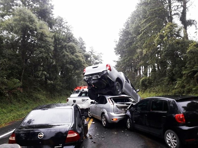 Um engavetamento envolvendo cinco veículos foi registrado nesta terça-feira (21) na BR-470, em Pouso Redondo, na região do Vale do Itajaí. O acidente ocorreu no local conhecido como Serra da Santa, por volta das 8h30. Com o impacto da colisão, uma caminhonete Hilux foi parar em cima de um Focus.