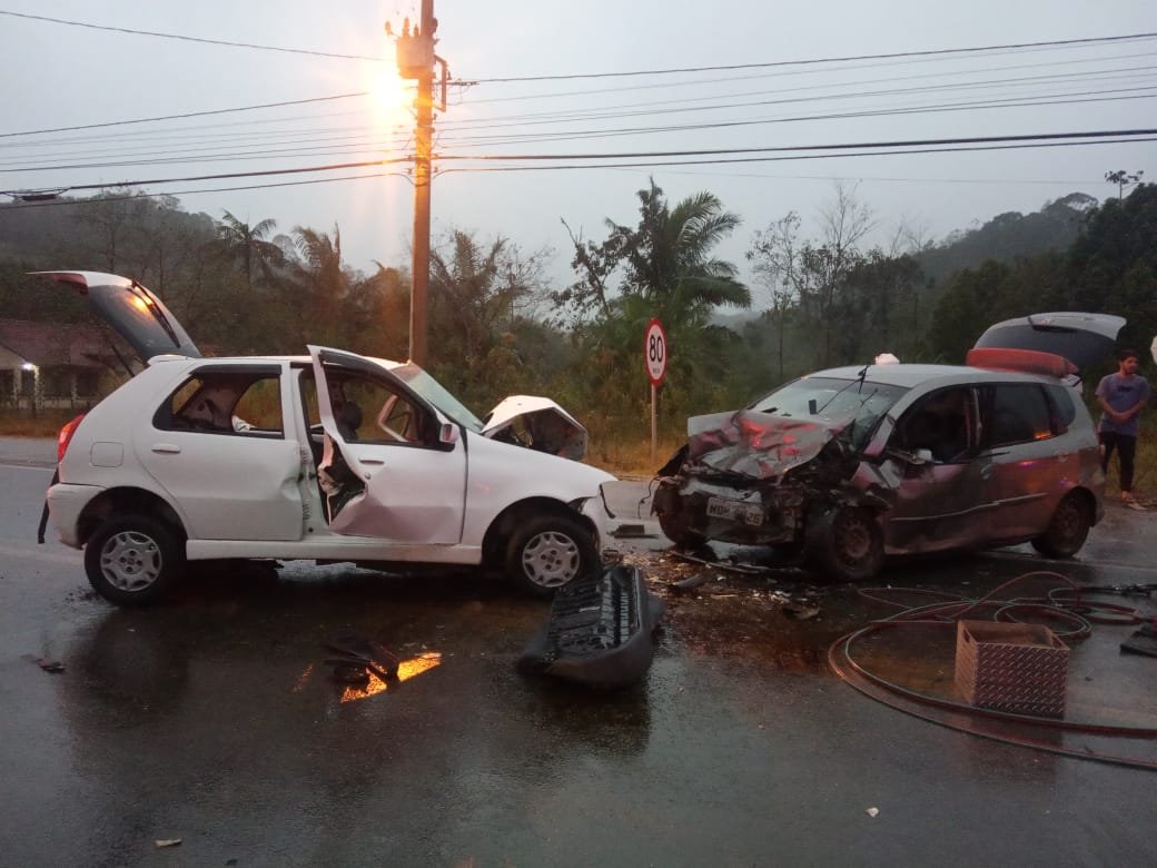 A colisão frontal envolveu um Fiat Palio Fire, que trafegava no sentido Pomerode, e um veículo Honda Fit, que estava no lado contrário. O Fiat invadiu a pista e bateu contra o Honda Fit.