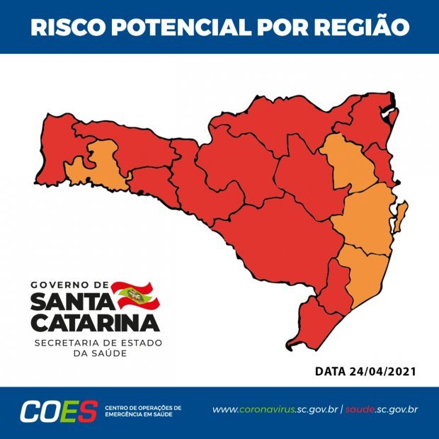 Grande Florianópolis, Laguna, Médio Vale do Itajaí e Oeste foram reclassificados para o nível grave (cor laranja). A última matriz, divulgada no dia 17, apontava todas as regiões com risco gravíssimo (cor vermelha).