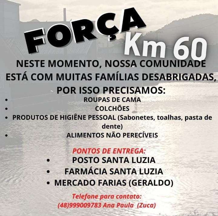 As pessoas que estiverem precisando de ajuda na região do Km 60 podem seguir até o Salão Paroquial da comunidade. Um cadastramento está sendo feito para melhor atender aos que buscam auxílio. Os que tiverem dificuldade de ir até o local, poderão acionar ajuda pelos telefones 48 99900-9783.