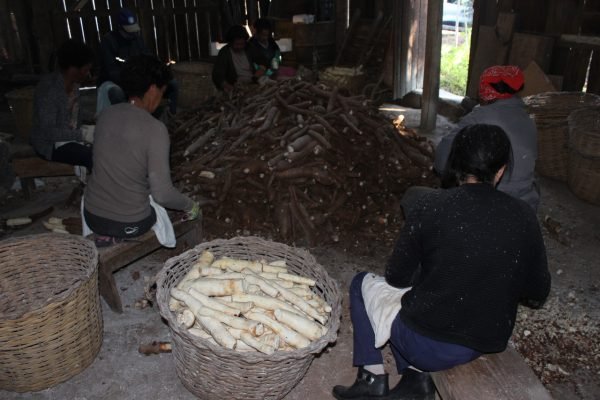 Mas seu Manoel não estava sozinho. Três metros daí, um grupo de sete ou oito mulheres raspava mais um lote de mandioca, que mais tarde viraria farinha e beiju, como o que aconteceu com o lote de seu Manoel, só que este já era de outro núcleo familiar.