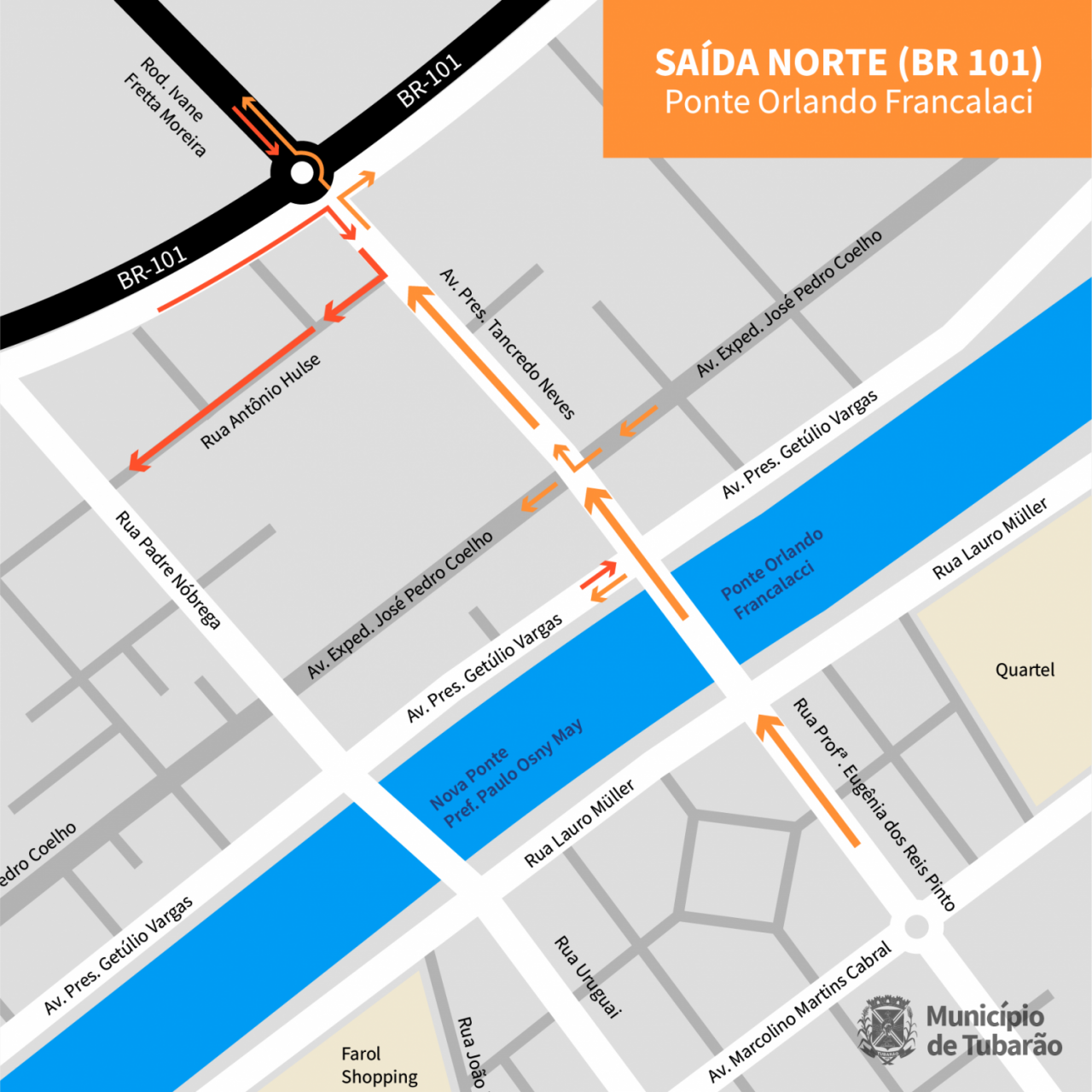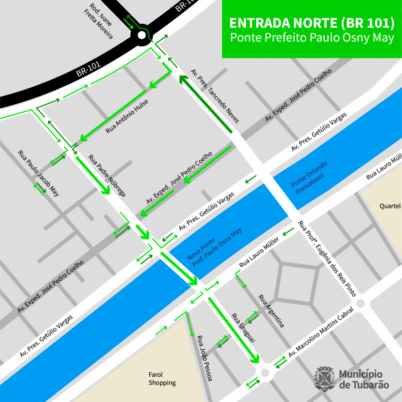 Assim, o binário de pontes no Acesso Norte terá o seguinte funcionamento: entrada para Tubarão pela ponte Prefeito Paulo Osny May e saída de Tubarão para a BR-101 ou para Capivari de Baixo pela ponte Orlando Francalacci.