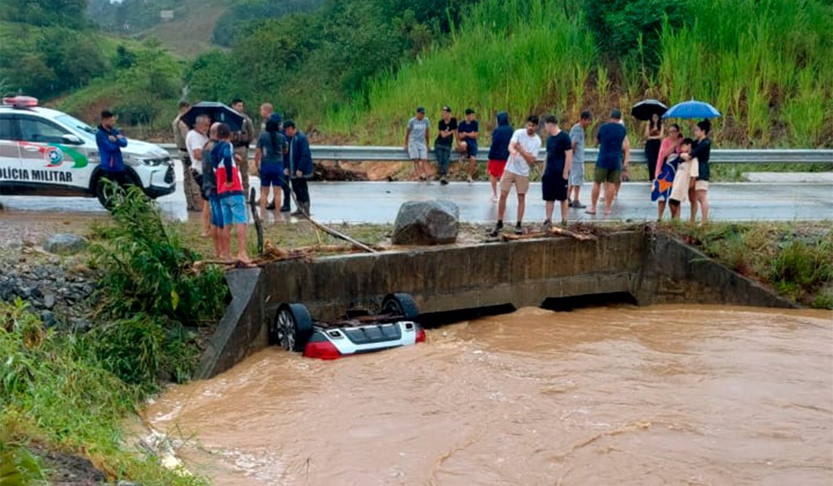 Segundo a PM, o carro — uma Land Rover vermelha — ficou completamente submerso e acabou preso, virado para baixo, em um pontilhão sob o Contorno Viário de Florianópolis. A retirada do veículo ocorreu por volta das 13h30min, com apoio do Corpo de Bombeiros Militar.