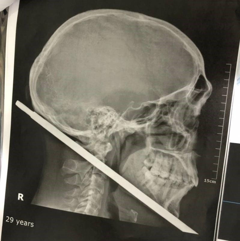 O Dr. Vinicius explica que o ferro transfixou a região inframandibular, fixando-se atrás do pavilhão auricular direito e fez um edema local. Os especialistas avaliaram que não havia comprometimento dos grandes vasos, entre elas, a artéria jugular, artéria carótida interna, externa, veia jugular interna e externa e por esse motivo, a cirurgia foi um sucesso.