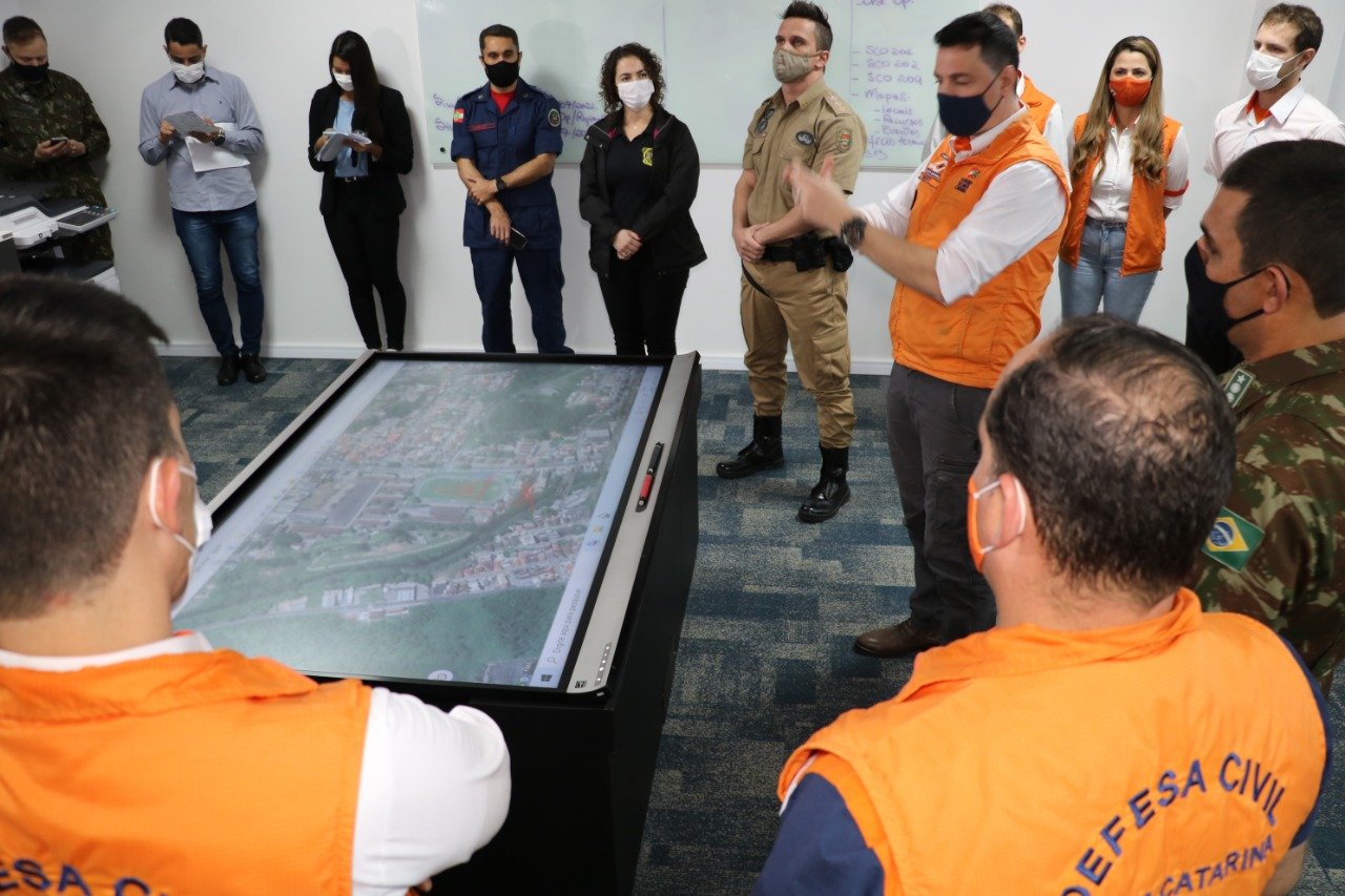 Após as explanações que ocorreram parte presencial e parte por chamada de vídeo, houve a definição das estratégias na mesa tática, com suporte de um mapa digital. Segundo o capitão do Corpo de Bombeiros Militar de Santa Catarina (CBMSC) e gerente de gestão de desastres da Defesa Civil de Santa Catarina (DCSC), Daniel Nunes, a intenção é integrar os esforços dos diversos setores e órgãos do Estado para o gerenciamento dos riscos e desastres em Santa Catarina.