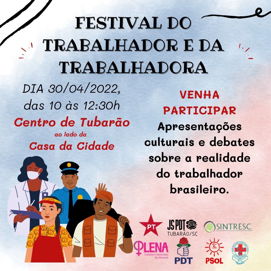 A celebração do Dia Internacional do Trabalhador e da Trabalhadora, será neste domingo (1°) de Maio. Porém um dia antes, em comemoração à data, será realizado em Tubarão, neste sábado (30), a partir das 10h, na Praça Pery Camisão, ao lado da Casa da Cidade, no centro, o Festival do Trabalhador e da Trabalhadora. A iniciativa tem o intuito de homenagear os trabalhadores e manifestar os desapontamentos, inclusive com a situação econômica atual da população.