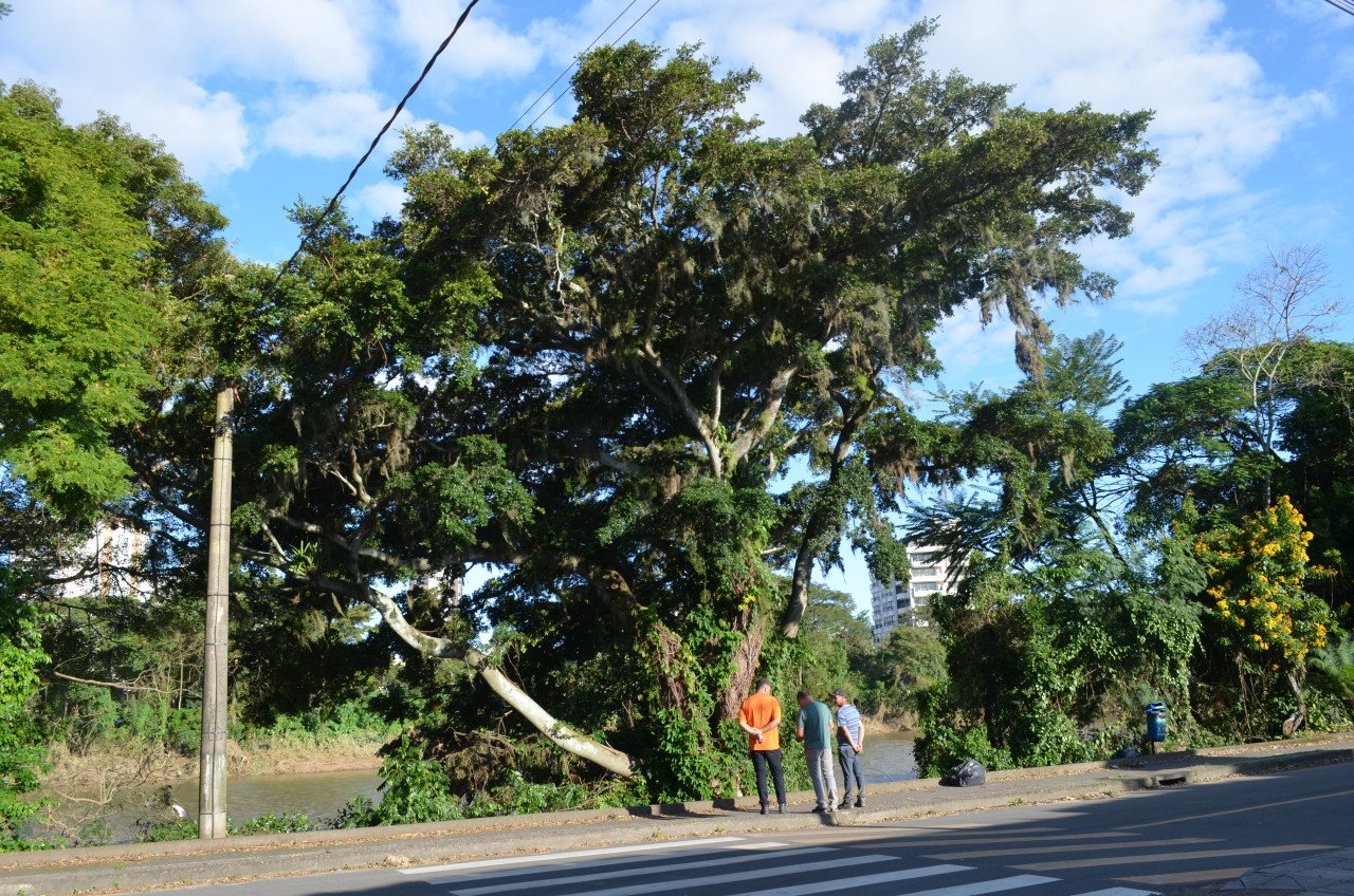 Quase arrancada pela correnteza do Rio Tubarão, na madrugada da última quinta-feira (5), uma figueira está na iminência de cair e será removida nesta terça-feira (10) pela Defesa Civil. A árvore de grande porte fica ao lado do Parque Linear, na Avenida Presidente Getulio Vargas, no trecho entre as pontes Dilney Chaves Cabral e Prefeito Paulo Osny May. A erosão deslocou boa parte das raízes e deixou a figueira bastante inclinada em direção ao rio. O corte da árvore será feito pela Defesa Civil, com apoio do Corpo de Bombeiros e servidores da Secretaria de Infraestrutura da Prefeitura. Pelo menos outras três árvores da beira-rio, duas delas já caídas, também serão removidas pela Defesa Civil neta terça-feira.