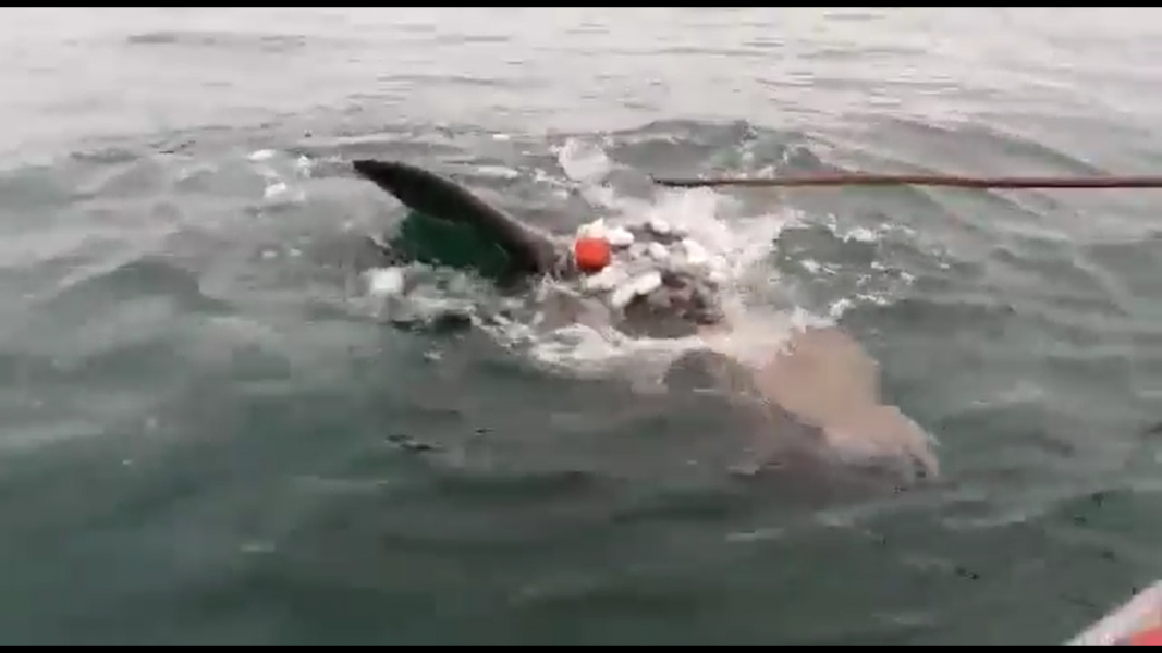 A diretora do Instituto conta que o filhote consegue se movimentar mesmo com a rede de pesca presa pelo corpo, mas a longo prazo representa risco para o animal.