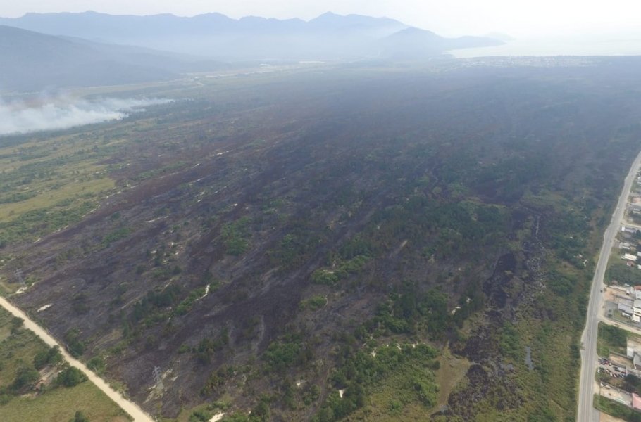 O incêndio atinge uma área de vegetação entre a praia da Pinheira e a BR-101, na Grande Florianópolis, bem como o Parque Estadual da Serra do Tabuleiro.