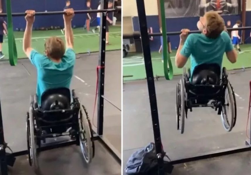 Ele nasceu com espinha bífida, o que o impediu de andar. Mas já provou que não há limites para sua força de vontade.Para fazer os exercícios, usa uma barra improvisada no aparelho de agachamento, segura a barra e se levanta do chão.