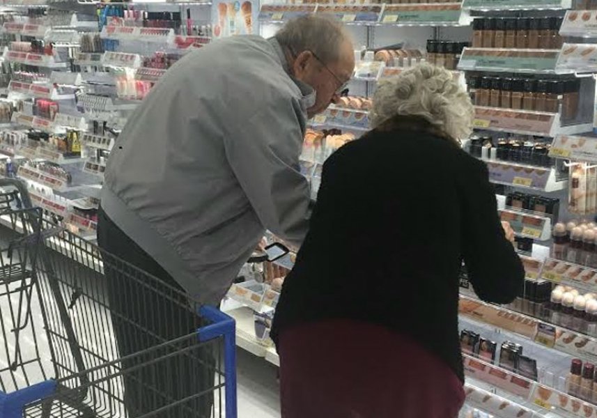 Um gesto de amor pra começar bem a semana. A Love What Matters , uma página que conta histórias de amor, compartilhou uma foto de um casal de idosos no corredor de uma loja de maquiagem
