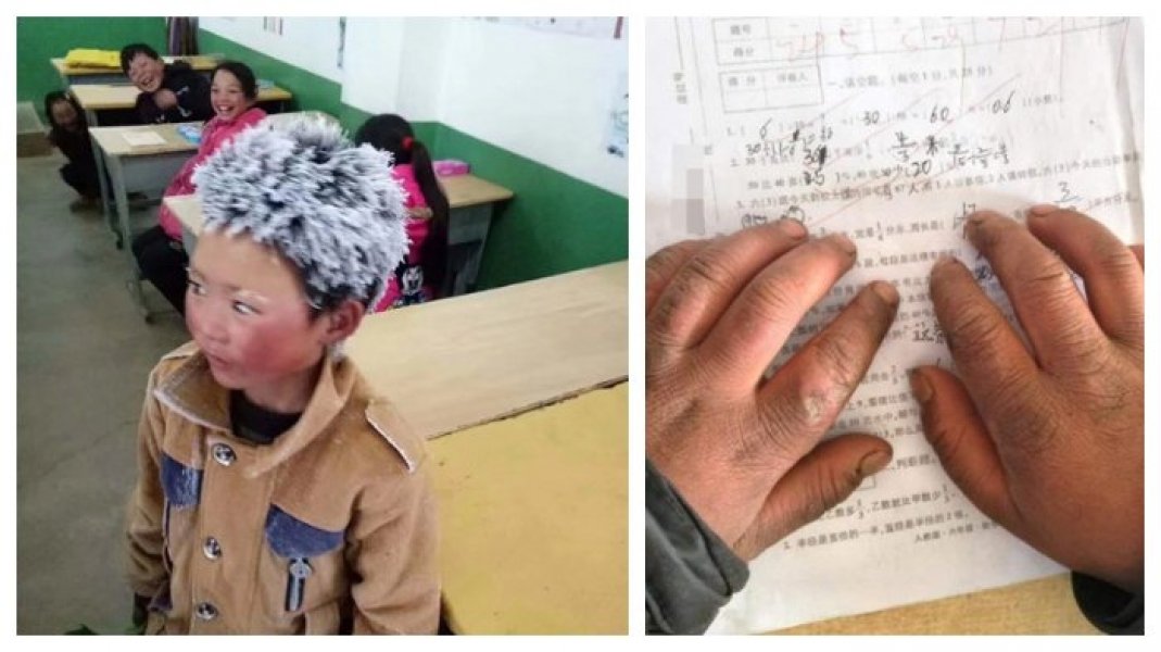 Outra foto mostra mãos ressecadas e muito machucadas, que poderiam ser as de um idoso. Mas realmente são as mãos congeladas de Fuman, que não tem luvas para se proteger nas longas caminhadas. Por trás do menor com as roupas úmidas, é possível ver como outros garotos, colegas dele no terceiro ano do primário, riem do seu aspecto.