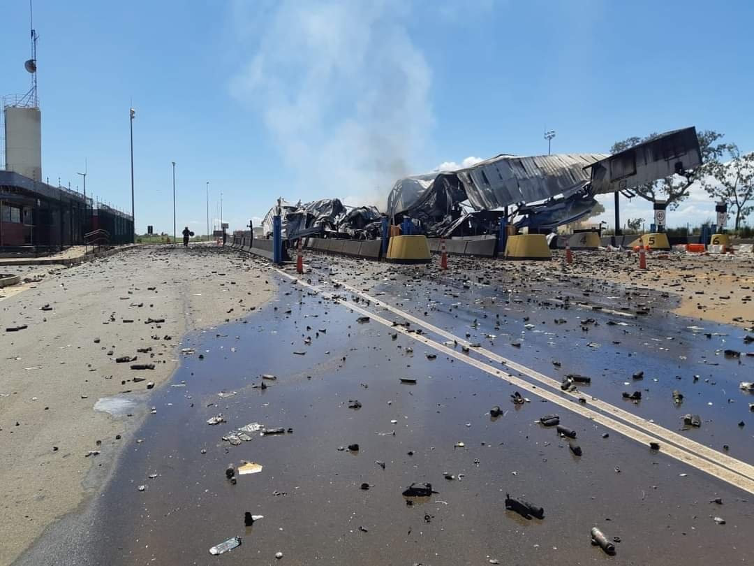 O motorista do caminhão que causou o acidente morreu no local. A praça de pedágio ficou destruída por causa do incêndio.