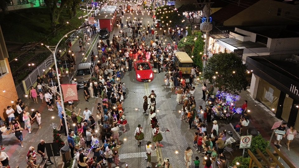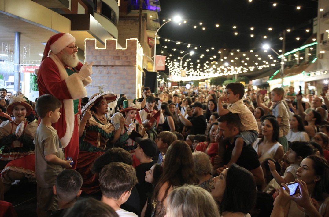 Após o acendimento das luzes e do tradicional varal com mais de 6 mil lâmpadas, um dos momentos mais aguardados tomou conta da avenida: a chegada do Papai Noel, desta vez em grande estilo. O Bom Velhinho entrou em cena a bordo de uma Ferrari vermelha, surpreendendo moradores e turistas que lotaram a rua principal.