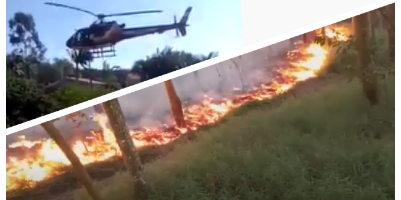 O helicóptero Arcanjo apoia o trabalho dos bombeiros por terra, buscando água em um açude para tentar apagar as chamas em um cesto preso na aeronave. O fogo teve início nesta madrugada e durante o dia se alastrou para uma plantação de eucalipto. Já é possível perceber uma grande área destruída.
