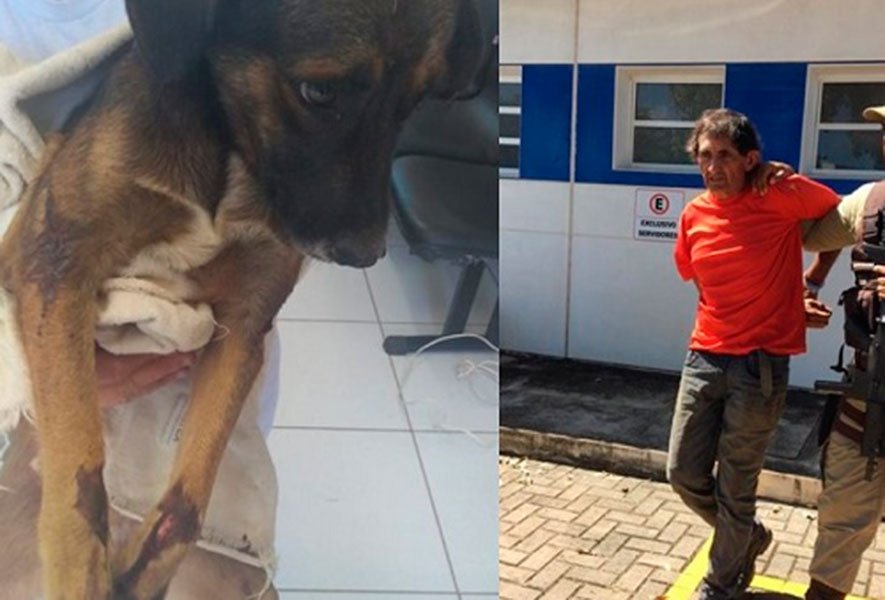 O cachorro foi socorrido e levado para atendimento veterinário. O animal teve ferimentos por todo o corpo, os ossos foram expostos, ele quebrou as quatro patas, e duas estão mutiladas.