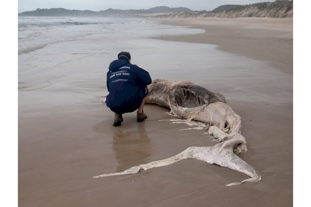Uma baleia foi encontrada em estado de decomposição encalhada na Praia da Ribanceira, em Imbituba, nesta sexta-feira (12). O animal apareceu pouco dias depois de uma baleia, também ser localizada por moradores em outra praia da cidade portuária, no final do mês passado. Por causa do avançado estado de decomposição não foi possível saber espécie do mamífero.