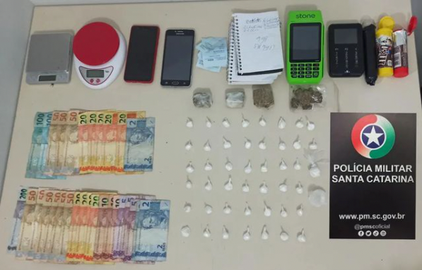 No local, os policiais encontraram 47 papelotes de cocaína; 70 gramas de maconha; dois aparelhos de telefone celular celular; R$ 1.081,00 em dinheiro, duas balanças de precisão utilizadas para porcionar as drogas; três cadernos com anotações relacionadas ao tráfico e duas máquinas de cartão, utilizadas para a venda dos entorpecentes. Todos os materiais apreendidos e o suspeito foram encaminhados à Delegacia de Polícia Civil para realização dos procedimentos cabíveis.