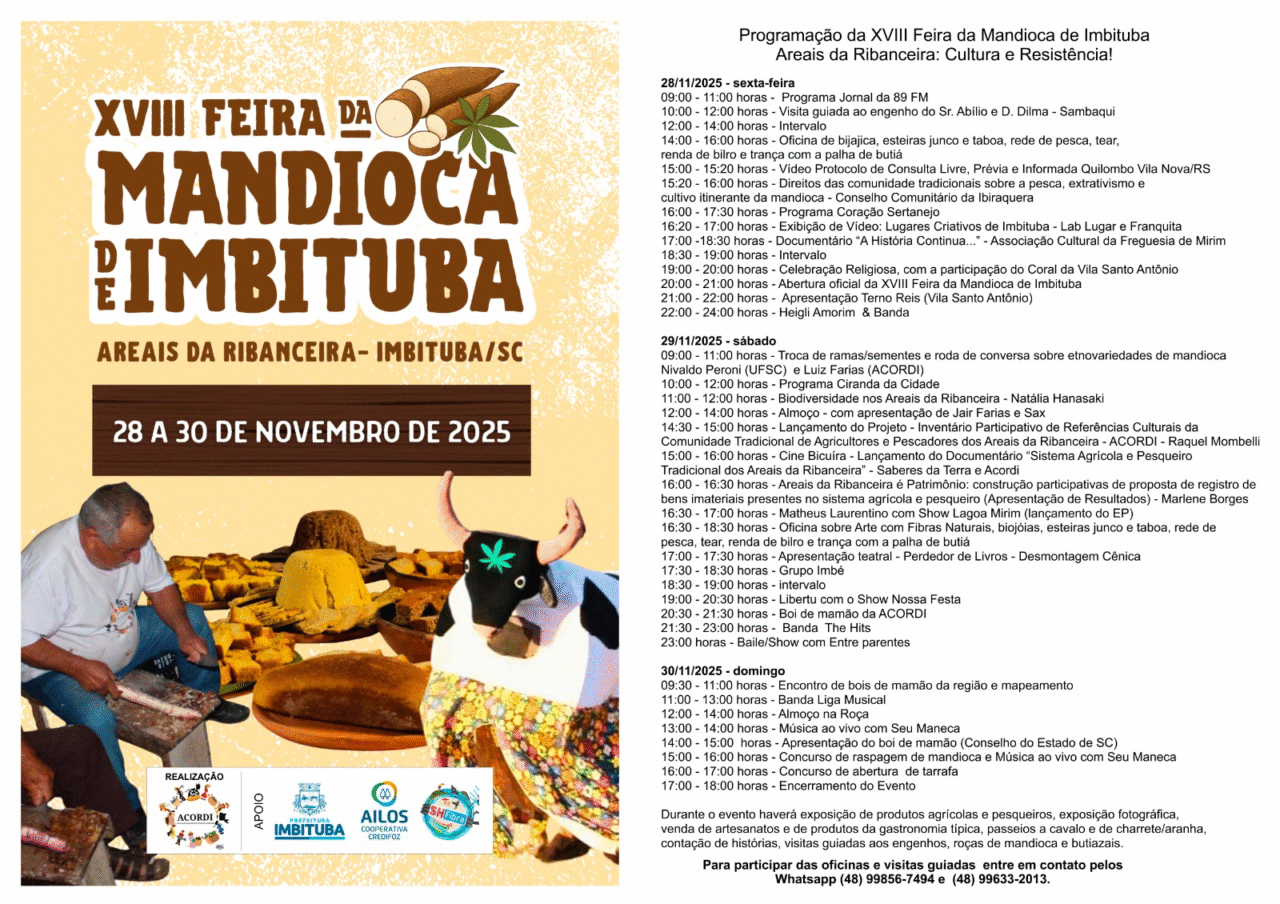 A mandioca — uma das culturas mais importantes e versáteis do mundo, reconhecida pela FAO como estratégica para o século 21 — será a grande protagonista da XVIII Feira da Mandioca de Imbituba, que ocorre entre 28 e 30 de novembro de 2025, nos Areais da Ribanceira. O evento celebra a riqueza cultural, agrícola e gastronômica da comunidade e reforça a preservação dos saberes tradicionais ligados aos engenhos de farinha.