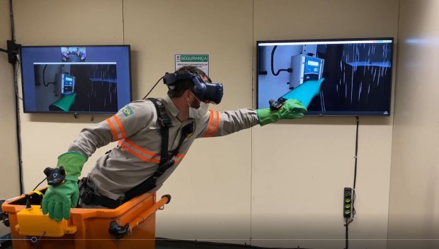 O cenário do estúdio de realidade virtual, no prédio da Administração Central da Celesc, em Florianópolis, tem apenas 20 metros quadrados e simula as mais diversas atuações de eletricistas em redes de distribuição de energia. Ao colocar um óculos de imersão em realidade virtual, o usuário é transportado para o ambiente de trabalho na rua: uma cesta aérea — equipamento acoplado em veículos no qual o eletricista é içado para realizar procedimentos no sistema elétrico —, que pode chegar a 12 metros de altura. A roupa antichamas, as botas, as luvas isoladoras, o talabarte e o cinto de ferramentas completam o equipamento necessário para deixar o contexto ainda mais próximo da experiência real.
