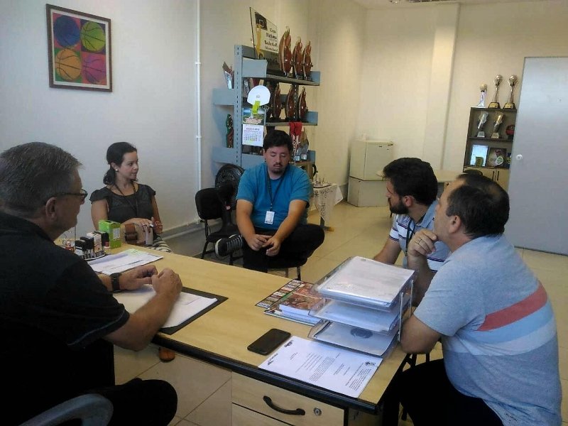 O diretor-presidente da Fundação, professor Luiz Ernani Buerger, o professor Marivaldo Oliveira de Souza, Guilherme Sada Ramos, Guilherme Rossi de Melo, Gabriele Mendes da Silva e Gabriela Tiscoski, representando o Ifsc, participaram do encontro que culminou na parceria.