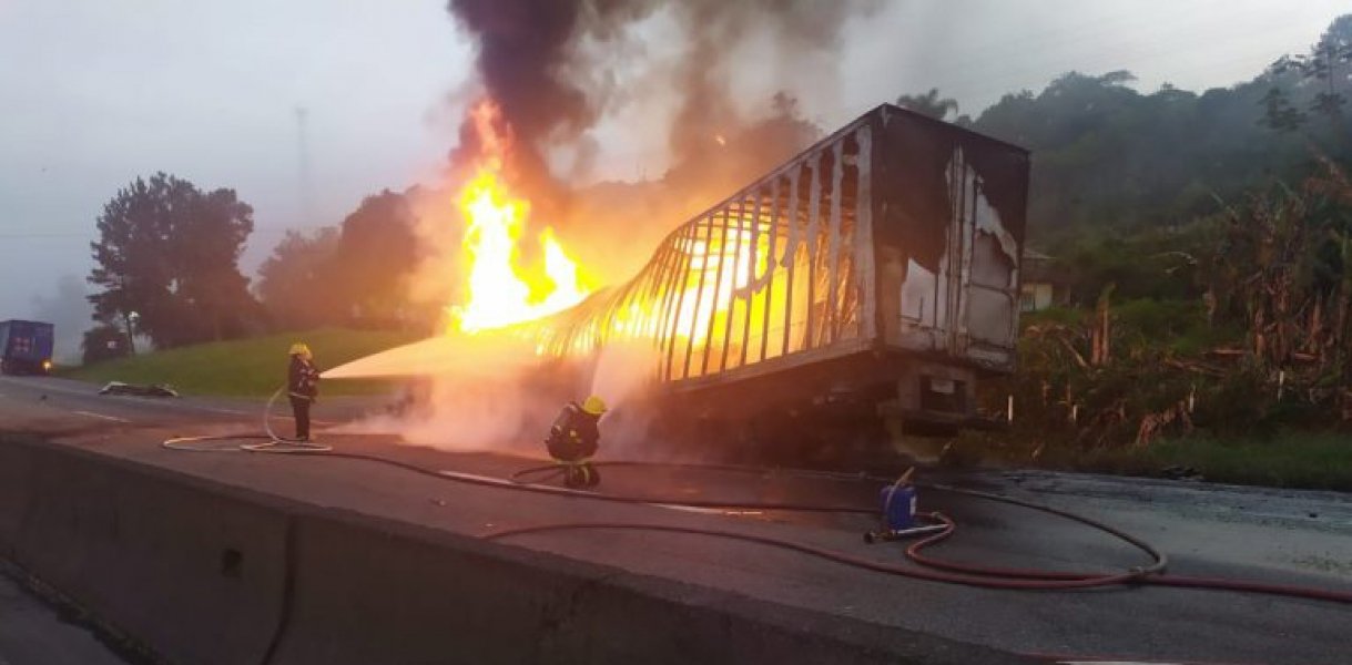 Conforme a PRF a carreta de Morro da Fumaça bateu na traseira do outro caminhão e pegou fogo. O outro motorista não teve ferimentos.