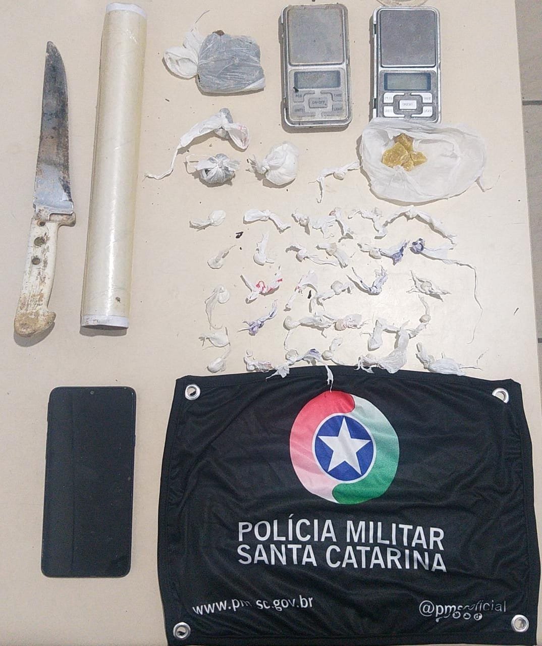 Com o homem, de 18 anos, foram encontradas duas porções de maconha, o qual inicialmente alegou serem para seu consumo. Mas com o emprego do cão da Guarnição do Canil foram encontradas no terreno onde ele estava uma porção de crack e outra de cocaína, além de uma faca, duas balanças e papel filme.