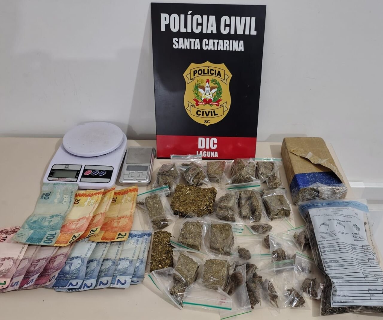 A Polícia Civil prendeu em flagrante um jovem de 21 anos pelo crime de tráfico de drogas em Laguna, na tarde desta quinta-feira. A ação foi realizada por agentes da Delegacia de Investigação Criminal (DIC) durante o cumprimento de um mandado de busca e apreensão no bairro Campo de Fora.