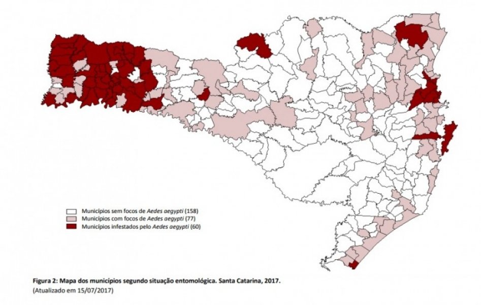 Municípios considerados infestados pelo mosquito Aedes aegypti: Águas de Chapecó, Coronel Martins, Maravilha, Quilombo, Águas Frias, Cunha Porã, Modelo, São Bernardino, Anchieta, Descanso, Mondaí, São Carlos, Balneário Camboriú, Dionísio Cerqueira, Navegantes, São Domingos, Bandeirante, Formosa do Sul, Nova Erechim, São José, Bom Jesus, ,Florianópolis, Nova Itaberaba, São José do Cedro, Brusque, Galvão, Novo Horizonte, São Lourenço do Oeste, Caibi, Guaraciaba, Palma, Sola, São Miguel do Oeste, Camboriú, Guarujá do Sul, Palmitos, Saudades, Campo Erê, Itajaí, Paraíso, Seara, Catanduvas, Itapema, Passo de Torres, Serra Alta, Caxambu do Sul, Itapiranga, Pinhalzinho, Chapecó, Ipuaçu, Planalto Alegre, União do Oeste , Cordilheira Alta, Joinville, Xanxerê, Coronel Freitas, Jupiá, Porto União, Xaxim.
