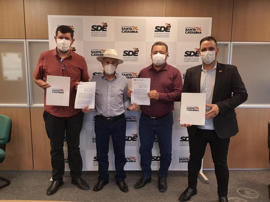 Os acordos foram assinados com a presença do secretário adjunto da Secretaria, Jairo Luiz Sartoretto, o diretor de Emprego e Renda da SDE, Diego Goulart, e dos prefeitos João Eduardo Della Giustina (Bocaina do Sul), Albino Gonçalves Padilha (Bom Retiro), Ibaneis Lembeck (São Ludgero) e Mauro Martini (Herval D’Oeste), além de integrantes das prefeituras.