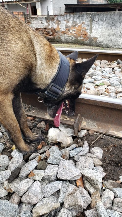 A maior parte da droga foi localizada com o auxílio do cão farejador, uma vez que estava escondida na linha férrea, em frente à casa onde os investigados estavam.