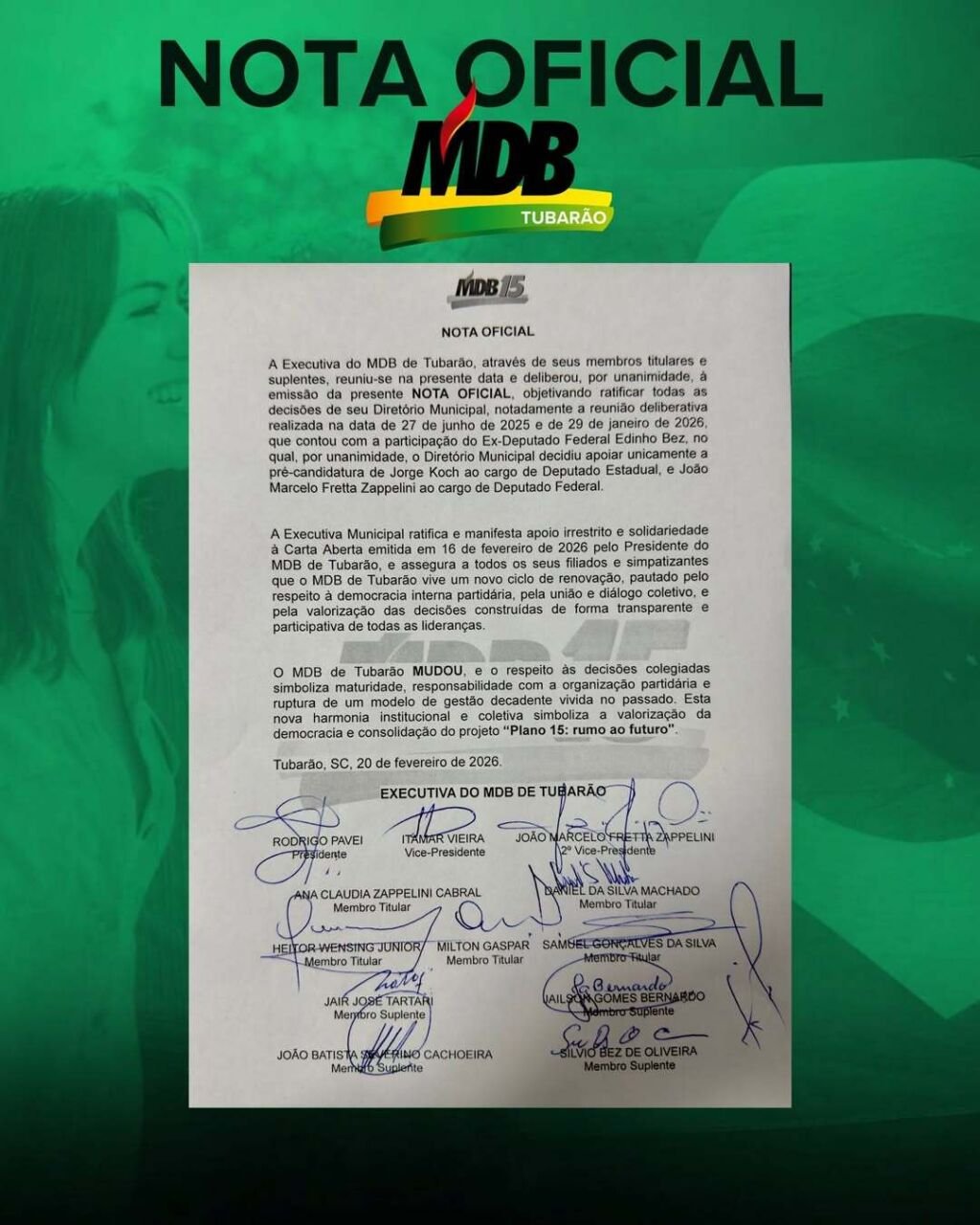 O texto também manifesta apoio irrestrito à Carta Aberta publicada em 16 de fevereiro de 2026 pelo presidente do partido em Tubarão. De acordo com a Executiva, o MDB local vive “um novo ciclo de renovação”, pautado pelo respeito à democracia interna, diálogo coletivo e valorização das decisões tomadas de forma transparente.
