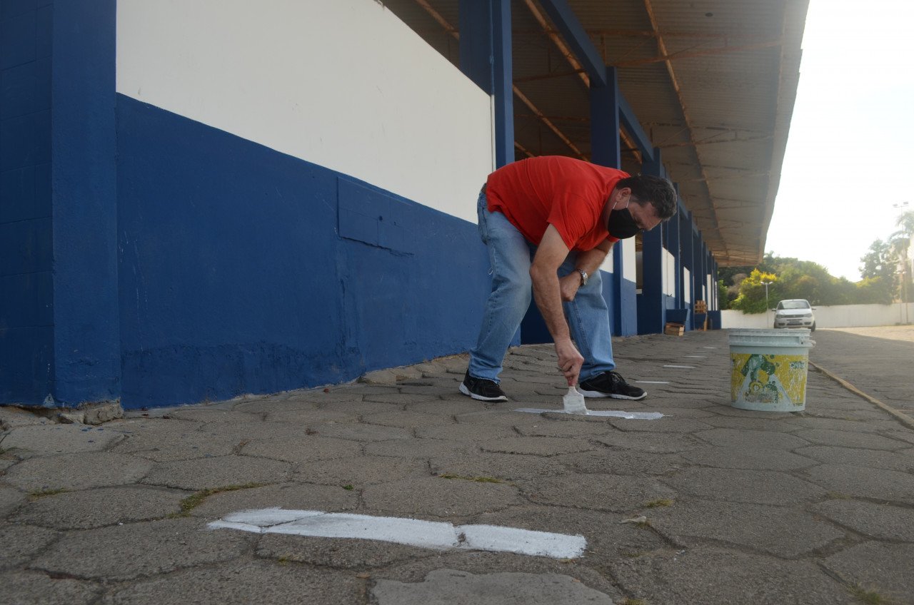 A gerência de Agricultura realizou uma marcação com tinta no piso para determinar o local em que cada cliente deve ficar para manter o distanciamento de 1,5 metro na fila. Dessa maneira, ficam preservadas todas as recomendações para evitar um possível contágio do novo coronavírus.