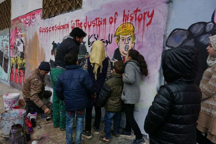 Um grupo de adolescentes carregava um cartaz que dizia “O sapato de haj Qassem vale mais do que a cabeça de Trump”.