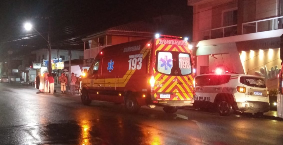 Após bater em um carro parado no acostamento, um automóvel virou e ficou de lado na Rua Coronel Fernandes Martins, no bairro Progresso, em Laguna. O acidente ocorreu por volta das 21h10 deste sábado (9).