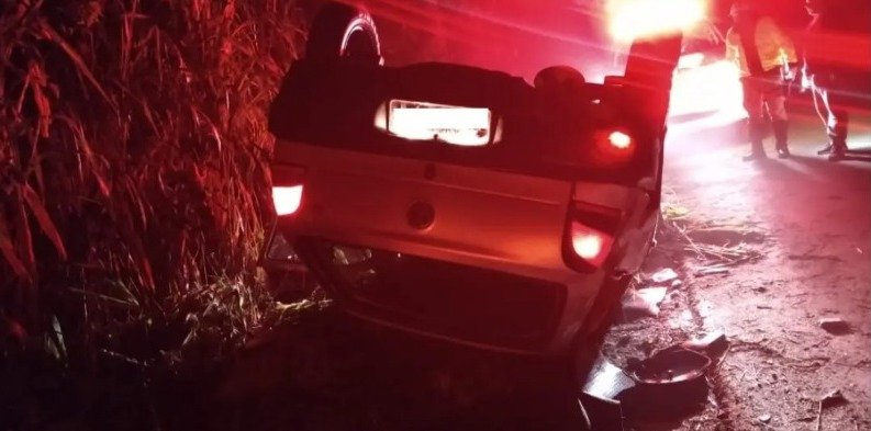 Após tentar ultrapassar um veículo, o motorista de um carro Volkswagen Gol, com placas de Lauro Muller, perdeu o controle da direção e capotou na madrugada desta sexta-feira (6). Três pessoas ficaram feridas.